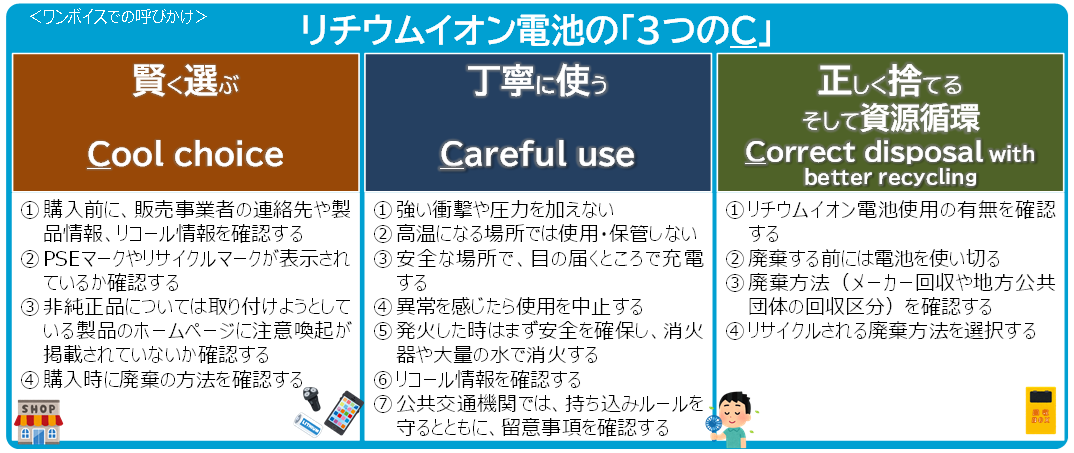 リチウムイオン電池の取り扱いについては、「賢く選ぶ」・「丁寧に使う」・「正しく捨てる、そして資源循環」が重要です。